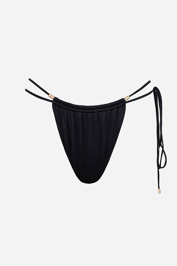 The iconic bikini bottom with double straps ties together at one side. The piece is topped with subtle gold decorative details and the luxurious silk-effect fabric in the sunlight. It can be worn with the 'Iconic Triangle Bikini Top with Double Tie String to Criss Cross'.